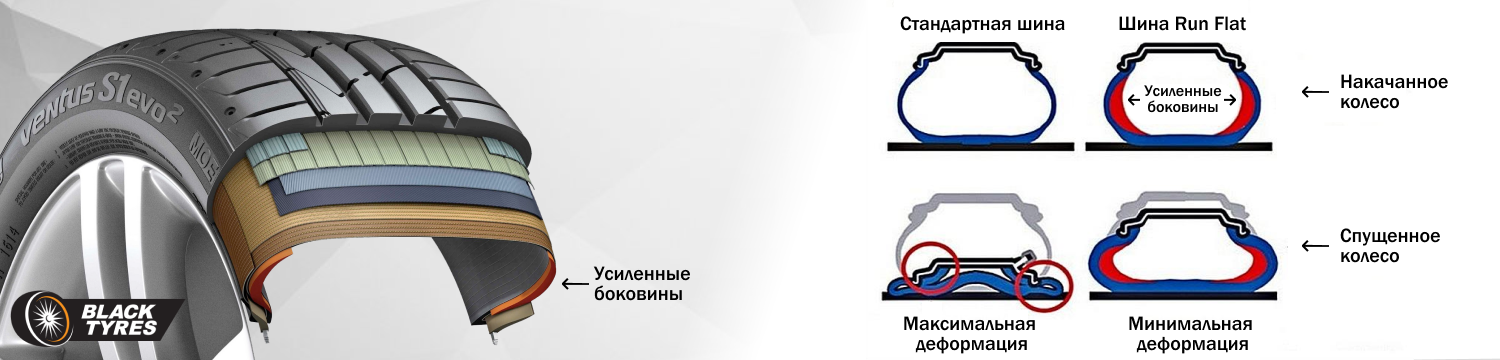 Отдельно нужно упомянуть о технологии RunFlat, предусматривающей усиление боковых сторон шины. В результате повреждения такая шина не сдувается и проседает под весом авто, а позволяет ехать даже после полной потери давления определенное расстояние на определенной скорости. Т.е. колесам обеспечивается дополнительная защита. Маркируется это качество на шинах по-разному — RSC, MOE, AOE – в зависимости от марки авто.