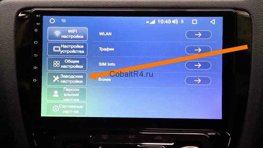 Откроются настройки магнитолы. Нас интересует вкладка “Заводские настройки”. Тапаем по ней: