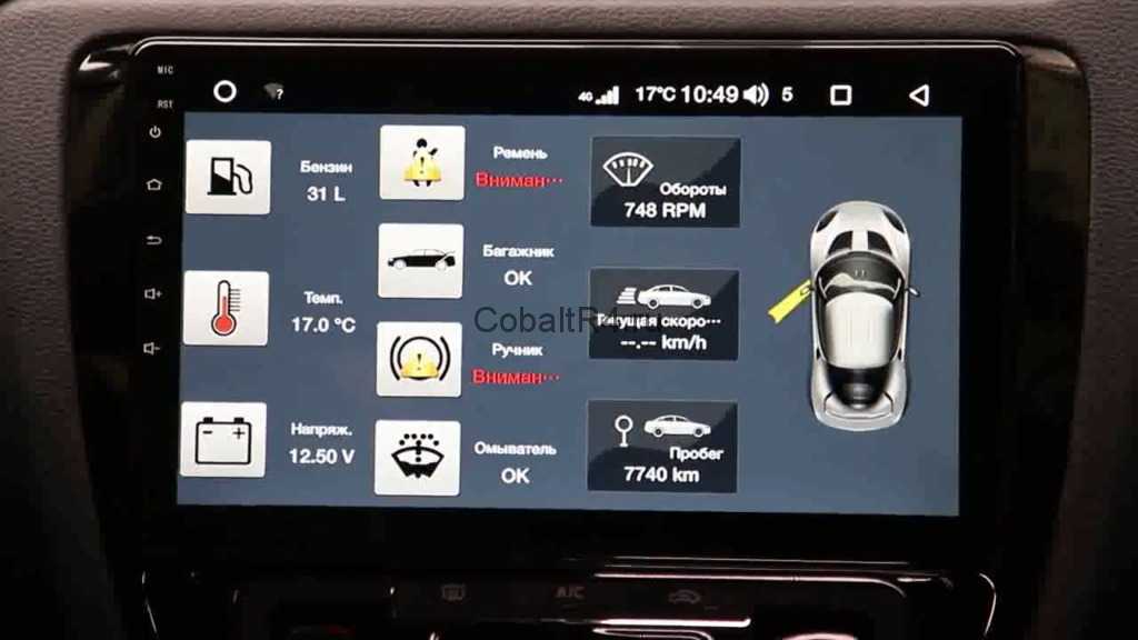 Среди них можно выделить уровень топлива в бензобаке (показания с ЭБУ ДУТ, особой точностью похвастаться не могут), температура охлаждающей жидкости ДВС, напряжение в бортовой сети, пристегнутые ремни, состояние концевика багажника, ручника, наличие стеклоомывающей жидкости. В некоторых автомобилях даже считываются числовые параметры, такие как обороты, скорость и пробег.