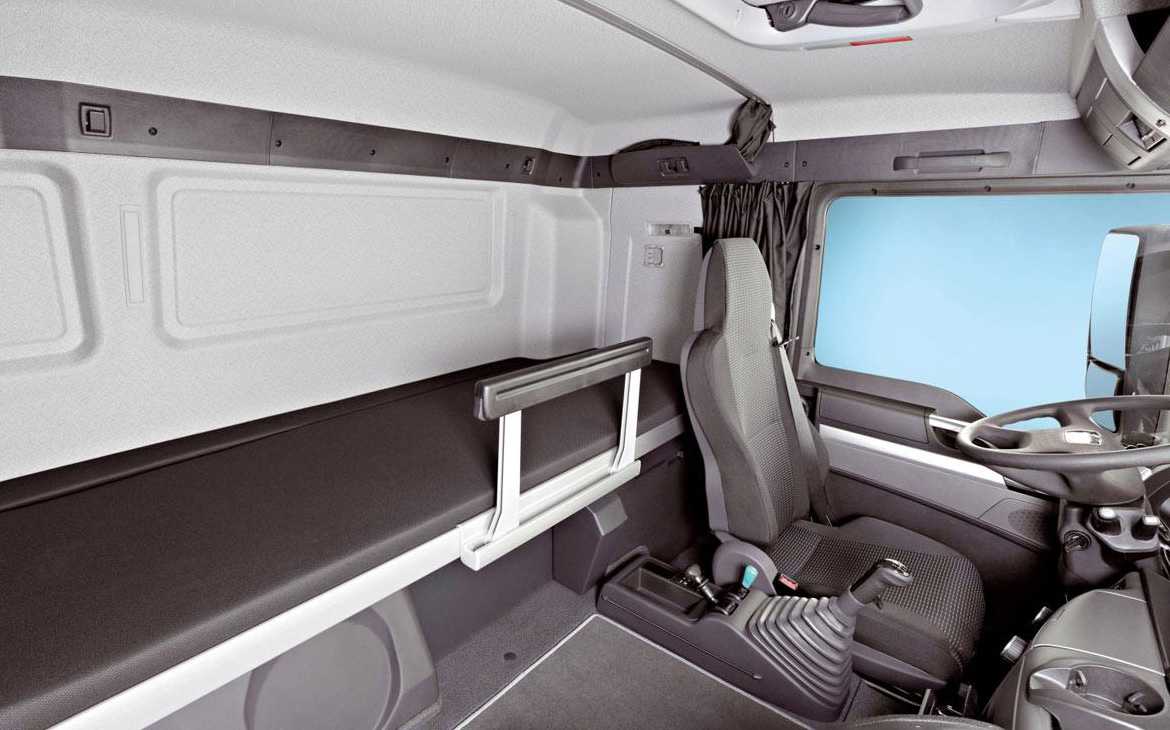 Задняя часть кабины МАН ТГС позволяет устанавливать дополнительное спальное место. Наличие большого заднего окна, расположенного за центральной стойкой, позволяет пропускать больше солнечного света, а также значительно улучшает обзорность.