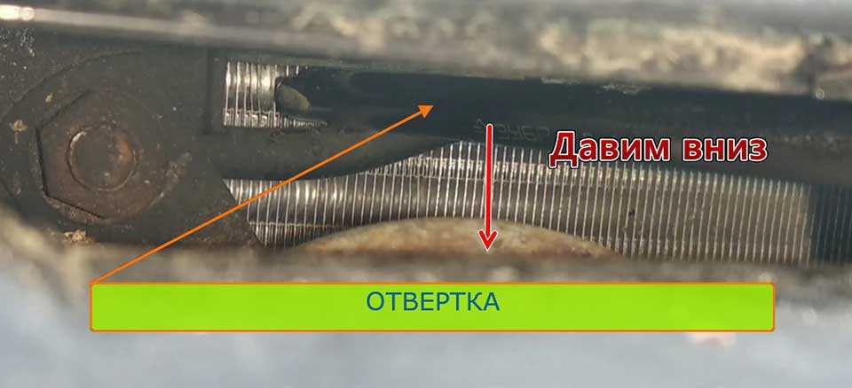 - С помощью крючка или специального приспособления аккуратно отведите рычаг в левую сторону до щелчка.