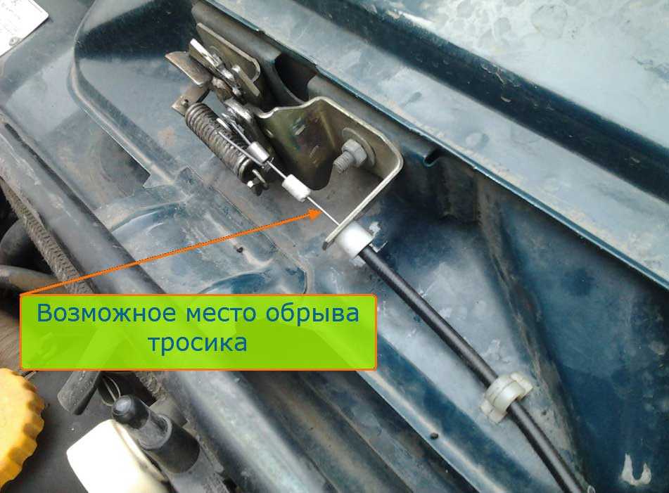 Обрыв троса легко распознать по свободному повороту рычага открывания капота.
