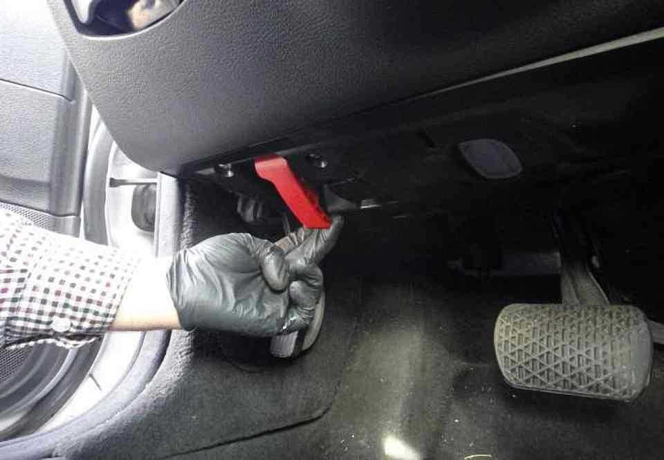 Для поиска рычага потребуется использовать крючок, скрученный из проволоки или специальное приспособление. Вставьте его в отверстие и аккуратно найдите рычаг открытия капота. Передвигайте его в горизонтальном направлении, пока не почувствуете сопротивление.