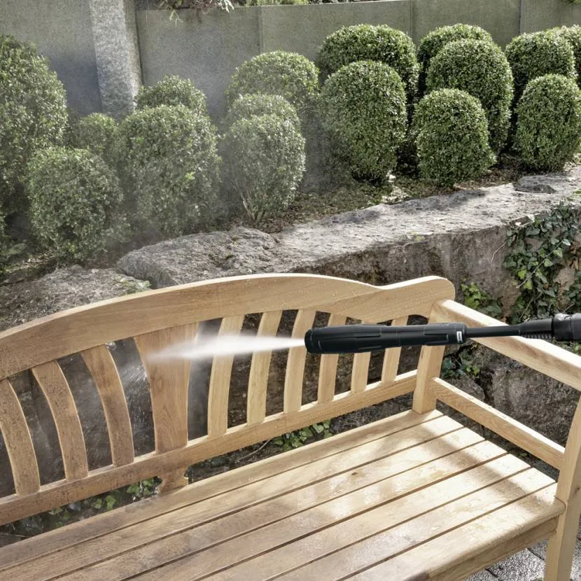 Модель оснащена стандартной и роторная насадкой, пеногенератором, неподвижной веерной трубкой. Можно использовать моющее средство и делать забор воды из бака. Шланг высокого давления хранится на держателе. Есть ручка для переноски. Длина шланга высокого давления 5 м, сетевого провода – 5 м.