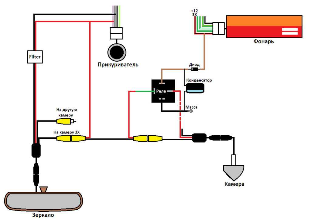 Стандартный метод подачи питания и активации камеры осуществляется через фонари заднего хода. Принцип работы следующий: