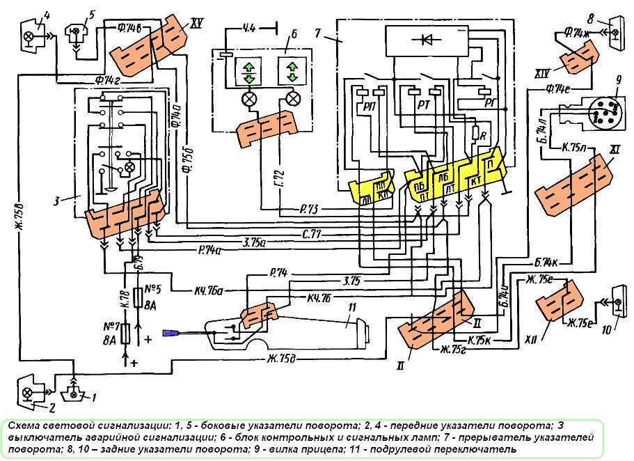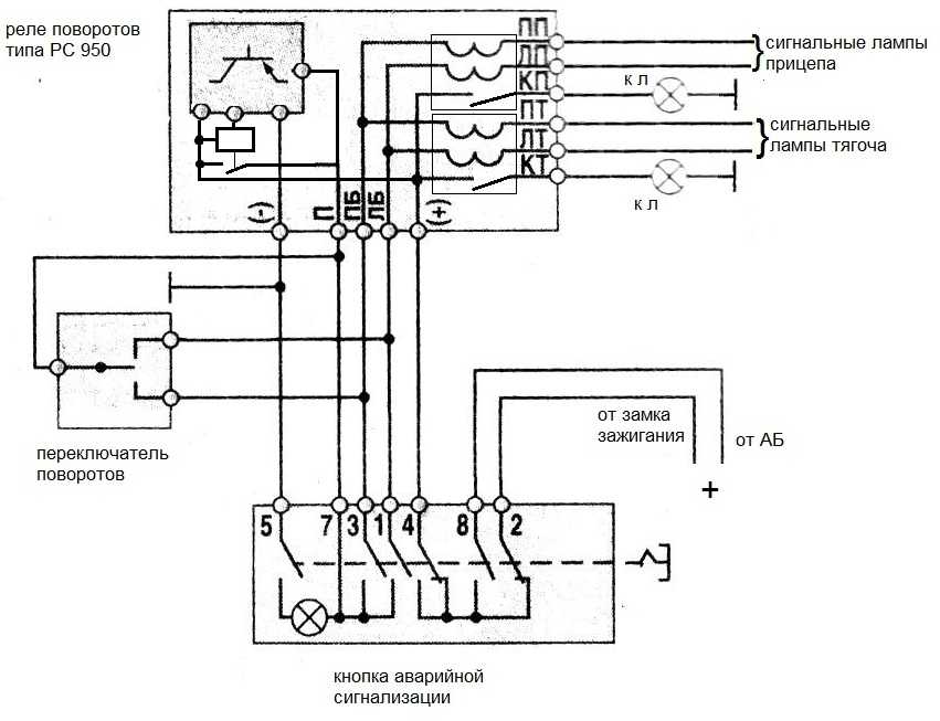 Остальные неисправности такие же, как и при применении других реле поворотов: неисправность предохранителей, кнопки аварийной сигнализации, обрыв или замыкание на массу проводов на сигнальные лампы и так далее. Ниже приведена принципиальная схема подключения реле поворотов КамАЗ.