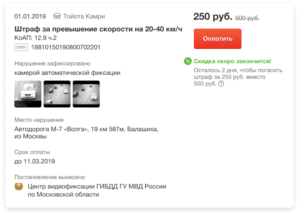Заплатите половину штрафа в течение 20 дней после оформления постановления о штрафе, включая дату постановления. Например, если штраф был выписан 5 мая, то скидка действует до 23:59:59 24 мая.