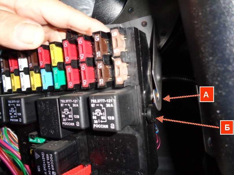 Блок реле и предохранителей системы впрыска расположен под панелью приборов в районе ног пассажира.