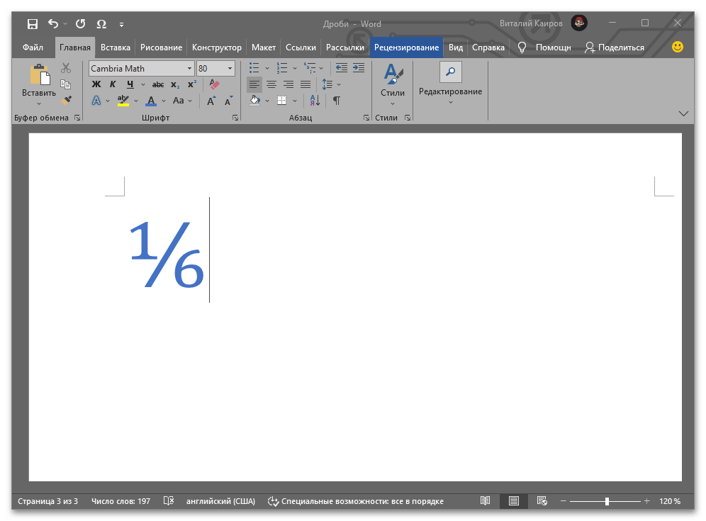 В базовом арсенале Microsoft Word содержится всего шесть знаков дробей со слеш-разделителем. Их добавление осуществляется по следующему алгоритму: