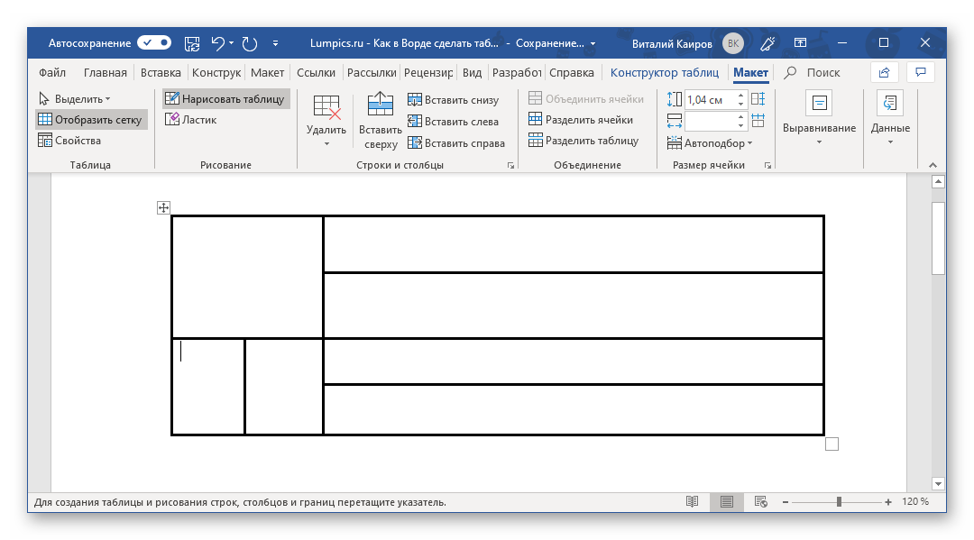 После этого курсор превратится в карандаш и с его помощью вы сможете нарисовать таблицу любого размера и формы. Для изменения типа линии, ее толщины и цвета используйте настройки на вкладке «Конструктор».