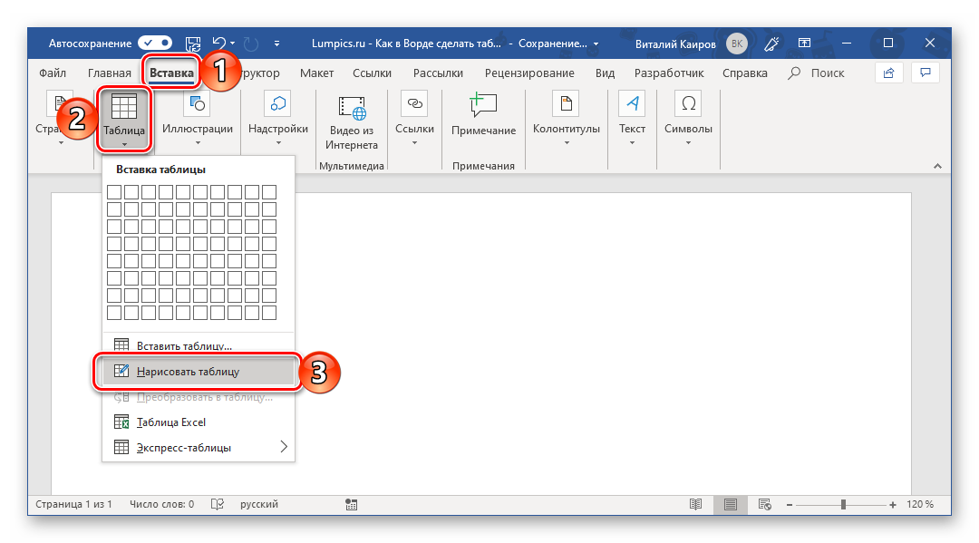 Если и этого недостаточно, то вы можете вручную нарисовать нужную таблицу. Для этого нужно нажать на кнопку «Таблица» и выбрать вариант «Нарисовать таблицу».
