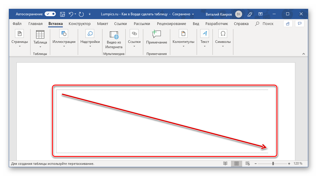 - Поместите курсор мыши внутрь таблицы.