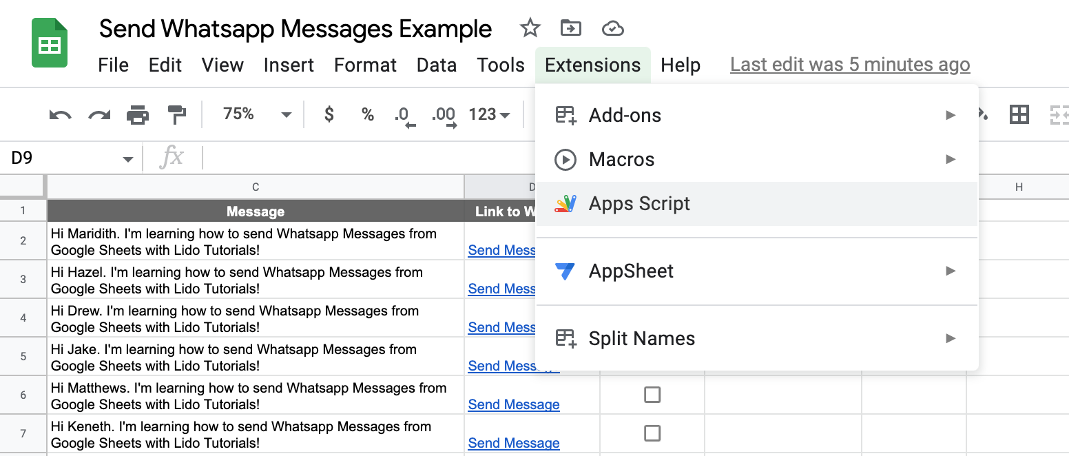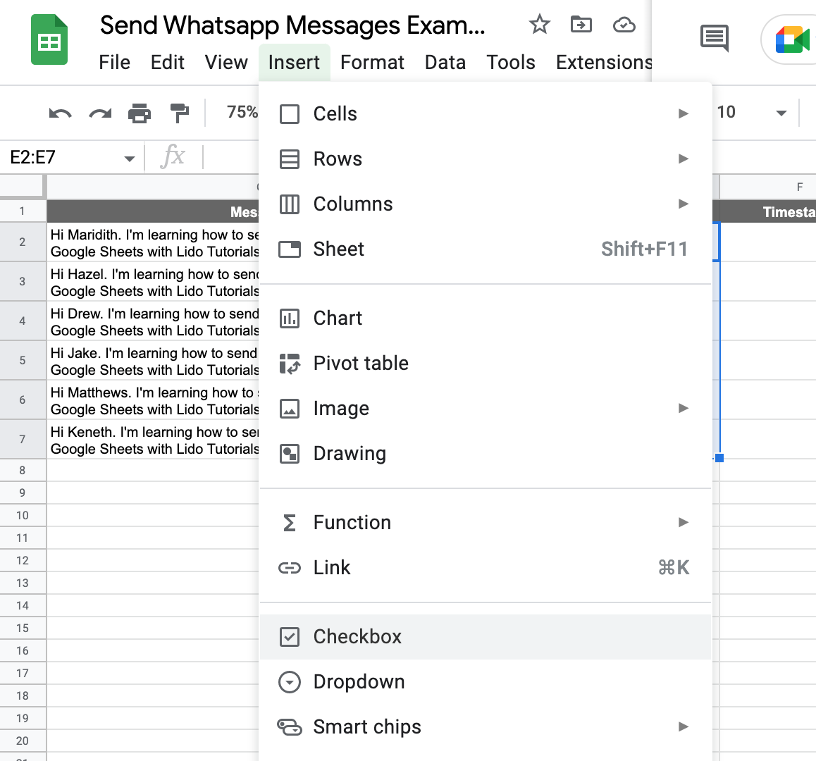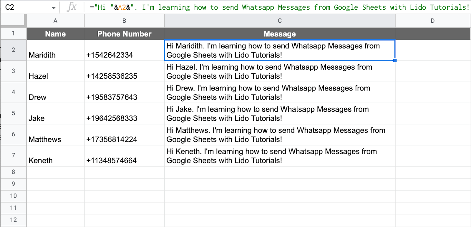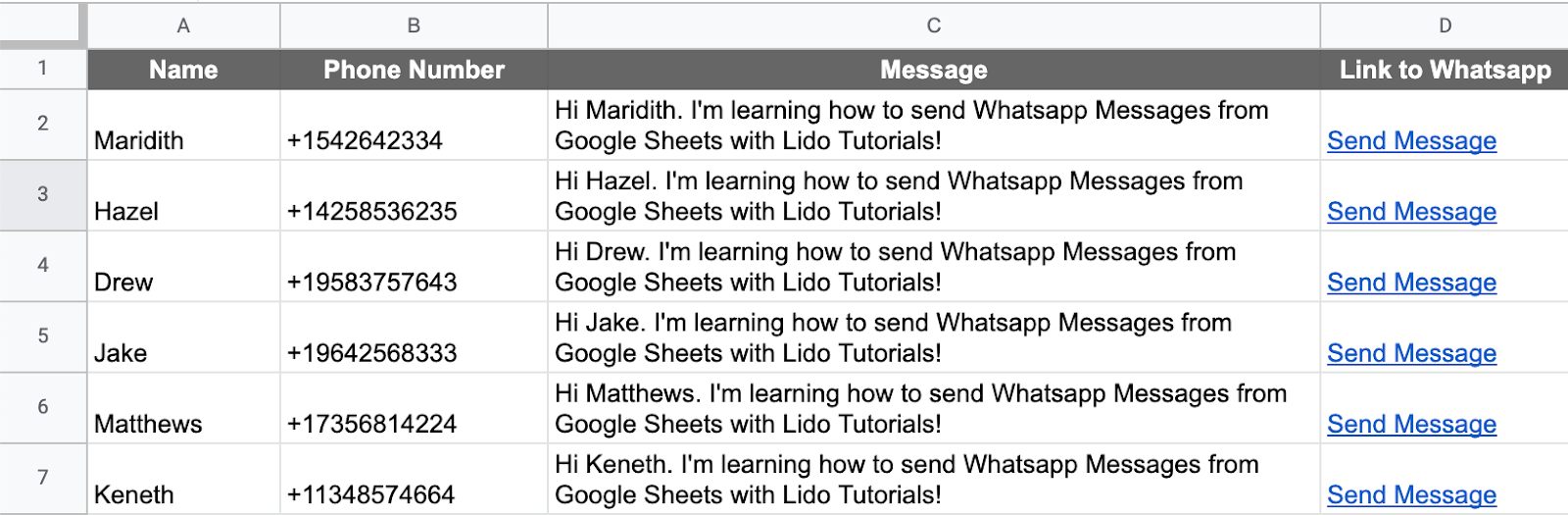 You can view the worksheet for the example above and it’s Apps Script code by going to: Send WhatsApp Messages Example