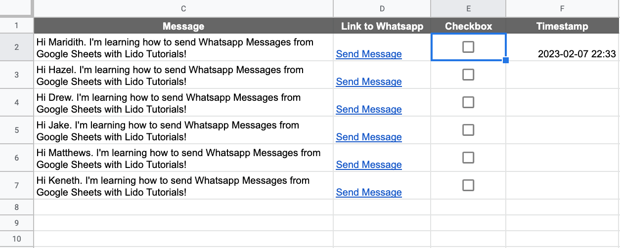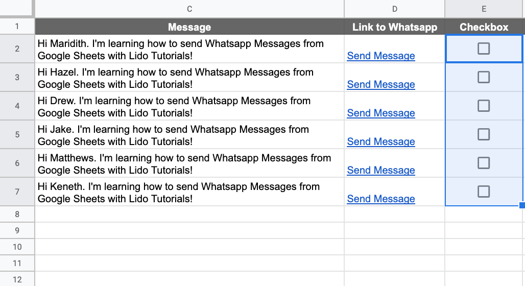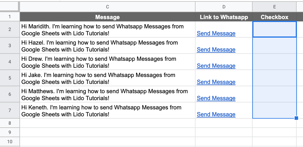 In our example sheet, we will select column E which is beside our WhatsApp hyperlinks.