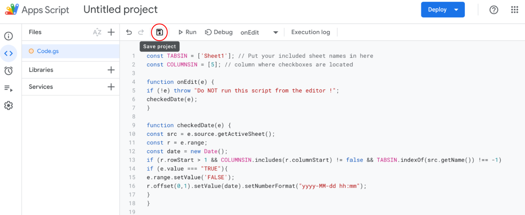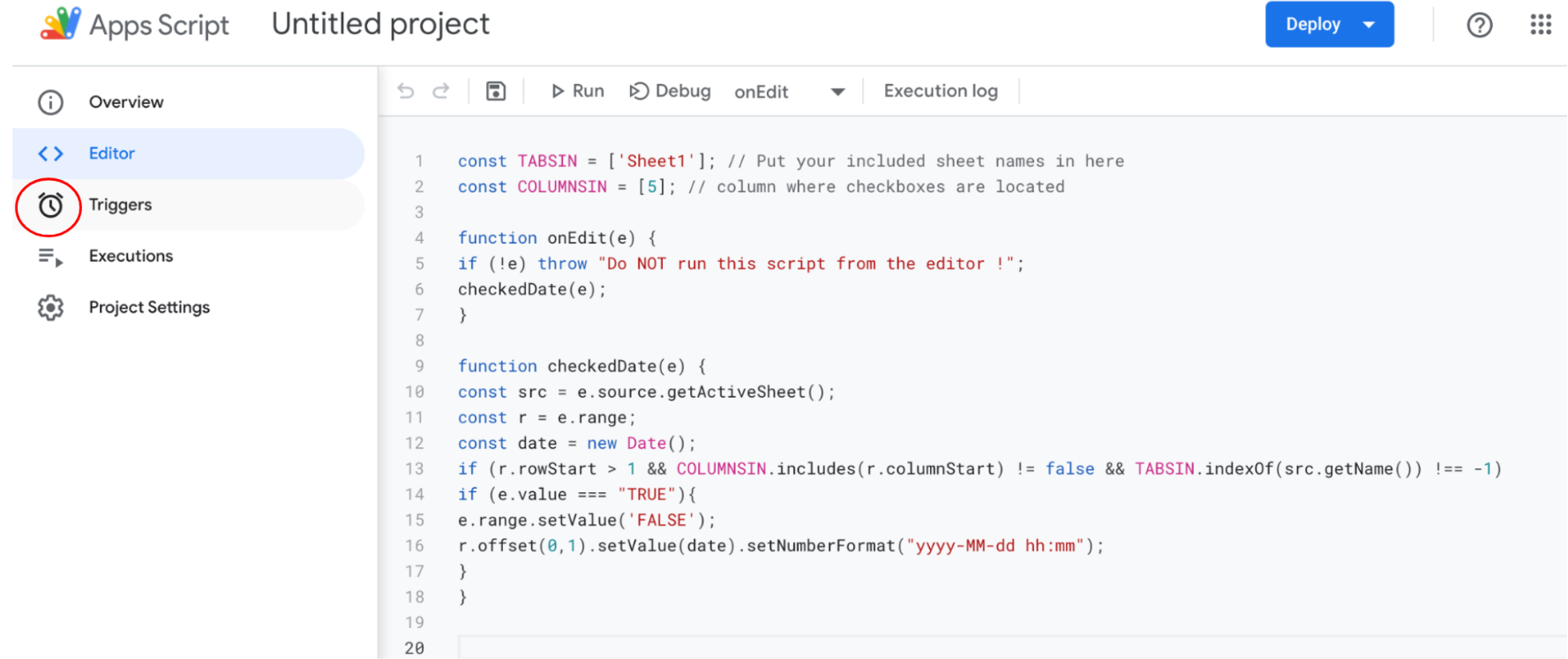 This will open a new tab for App Script. This is where we will create our program to automate the adding of a timestamp.