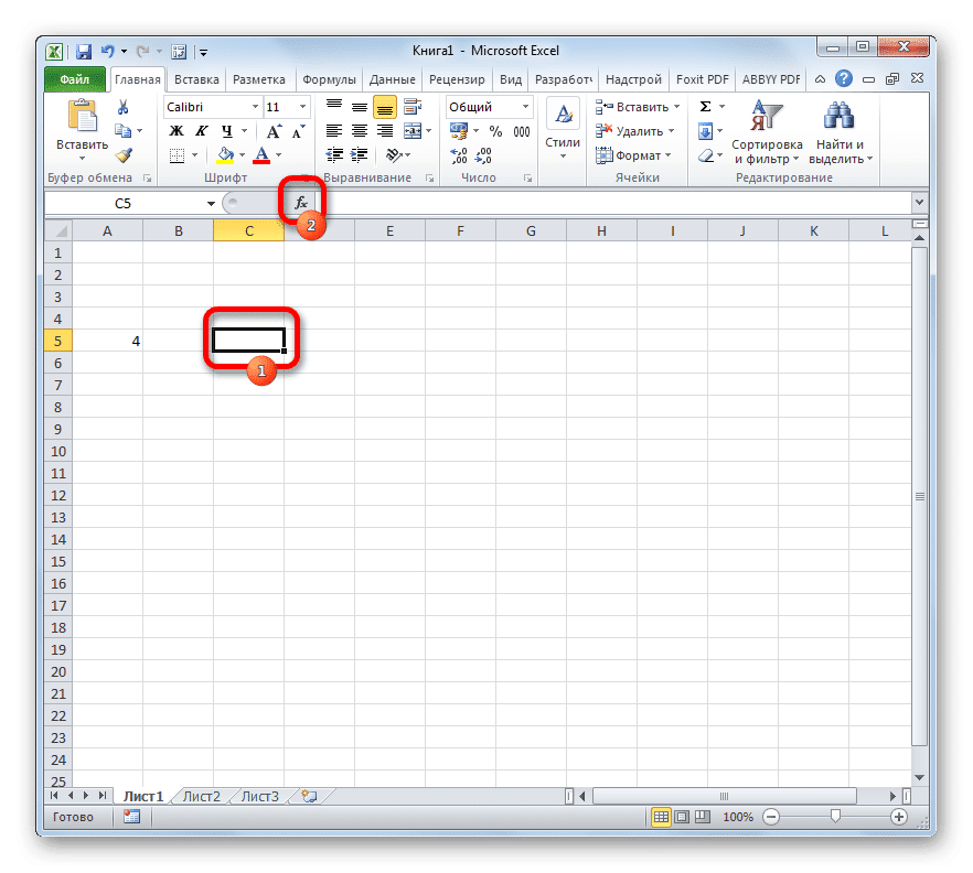 - Встаем в ячейку, в которой хотим выполнить расчеты. После этого жмем кнопку “Вставить функцию” (fx) слева от строки формул.