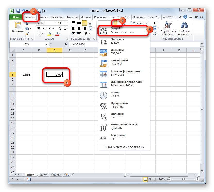 - Это произошло из-за того, что при выводе результата программа ориентируется на форматы ячеек, участвующих в формуле. Т.е. в нашем случае результирующей ячейке присвоен формат “Время”. Сменить его на “Общий” можно как во вкладке “Главная” (блок инструментов “Число”), как было рассмотрено выше, так и в окне формата ячеек, в которое можно попасть через контекстное меню ячейки, вызываемое щелчком правой кнопки мыши по ней.Оказавшись в окне форматирования в перечне слева выбираем строку “Общий” и жмем кнопку OK.