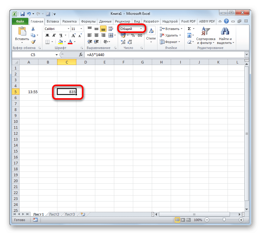 Самый простой способ перевести часы в минуты — это умножить их на определенный коэффициент. Выше мы обнаружили, что Excel воспринимает время в днях. Следовательно, чтобы получить минуты из выражения в часах, вам нужно умножить это выражение на 60 (количество минут в часах) и на 24 (количество часов в сутках). Следовательно, коэффициент, на который нам нужно умножить значение, равен 60 × 24 = 1440. Посмотрим, как это будет выглядеть на практике.