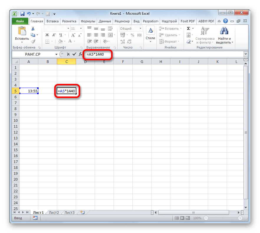 Данный метод является самым простым и предполагает использование формулы умножения. Для перевода часов в минуты нужно заданное время сначала умножить на 60 (количество минут в одном часе), затем – на 24 (количество часов в одних сутках). Другими словами, нам нужно умножить время на число 1440. Давайте попробуем это сделать на практическом примере.