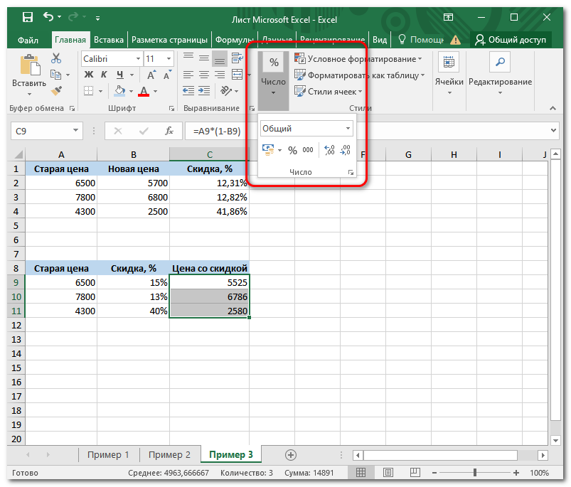 - Задайте столбику со скидкой процентный формат и пропишите в нем формулу, приведенную выше.