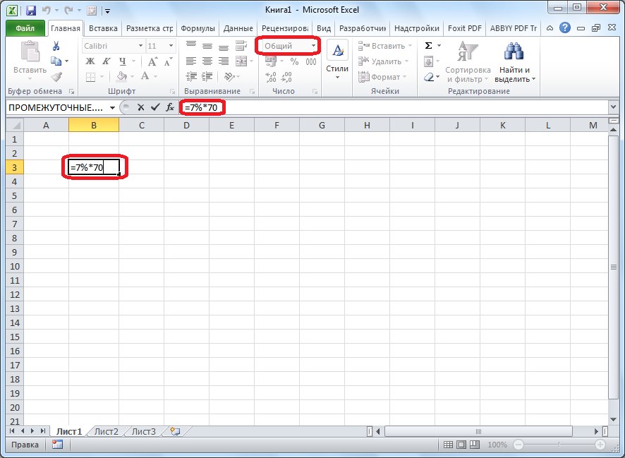 - Формула для расчета будет иметь следующий вид: . Следовательно, если нам понадобилось посчитать, какое число составляет, например, 7% от 70, то просто вводим в ячейку выражение «=7%*70». Так как в итоге мы получаем число, а не процент, то в этом случае устанавливать процентный формат не надо. Он должен быть или общий, или числовой.
