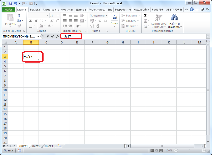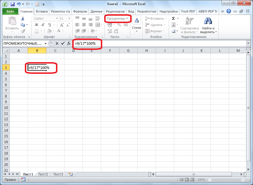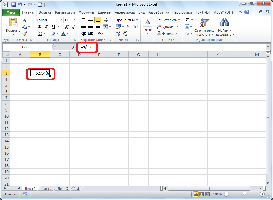 Впрочем, так как мы задали процентный формат ячейки, дописывать значение «*100%» не обязательно. Достаточно ограничиться записью «=9/17».