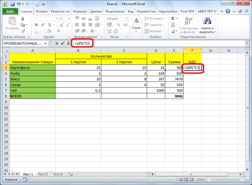 Эту модель довольно удобно применять и для работы с таблицами. Например, нам нужно от выручки каждого наименования товара подсчитать сумму величины НДС, которая составляет 18%. Для этого выбираем пустую ячейку в строке с наименованием товара. Она станет одним из составных элементов столбца, в котором будут указаны суммы НДС. Форматируем ее в процентный формат и ставим в ней знак «=». Набираем на клавиатуре число 18% и знак «*». Далее кликаем по ячейке, в которой находится сумма выручки от продажи данного наименования товара. Формула готова. Менять формат ячейки на процентный или делать ссылки абсолютными не следует.
