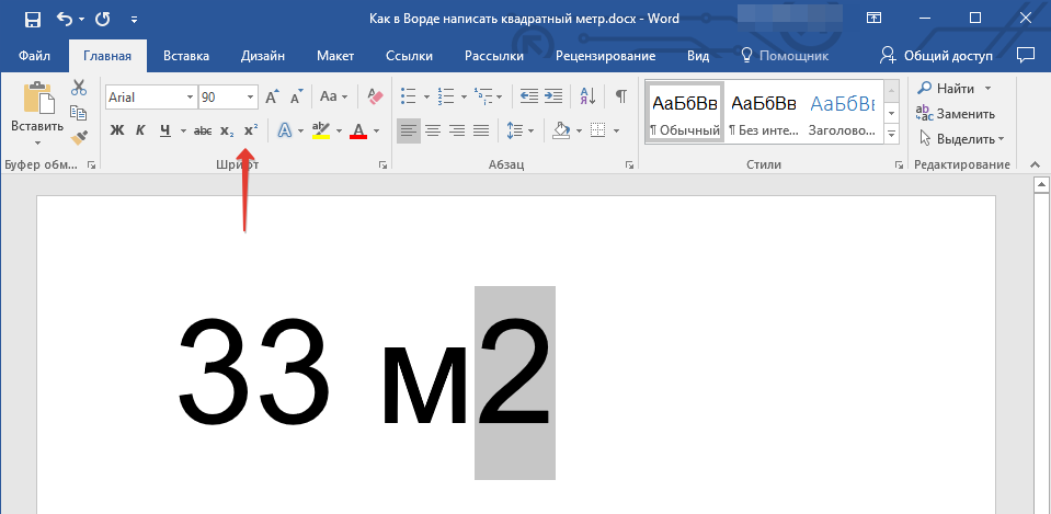 3. Во вкладке “Главная” в группе “Шрифт” нажмите на кнопку “Надстрочный знак” (x с цифрой 2 справа вверху).