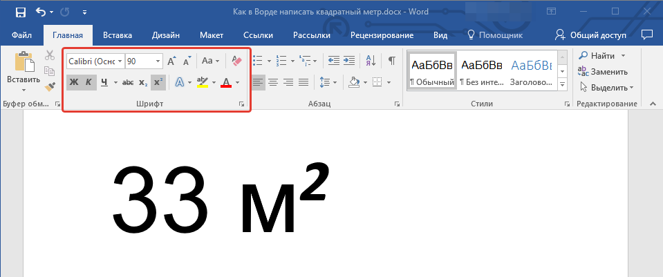 Поставить знак кубического или квадратного метра в Word нам поможет один из инструментов группы “Шрифт”, именуемый “Надстрочный знак”.