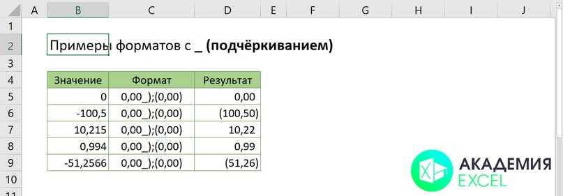 Подчеркивание (_) используется для добавления пробела в числовом формате. Символ, следующий за символом подчеркивания, определяет, сколько места нужно добавить. Обычным использованием символа подчеркивания является добавление пространства для выравнивания положительных и отрицательных значений, когда числовой формат добавляет круглые скобки только к отрицательным числам. Например, числовой формат «0 _»; (0) » добавляет немного места справа от положительных чисел, чтобы они оставались выровненными с отрицательными числами, заключенными в круглые скобки.