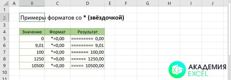 Звёздочка (*) используется для повторения символов. Символ, следующий за звездочкой, будет повторяться, чтобы заполнить оставшееся пространство в ячейке.