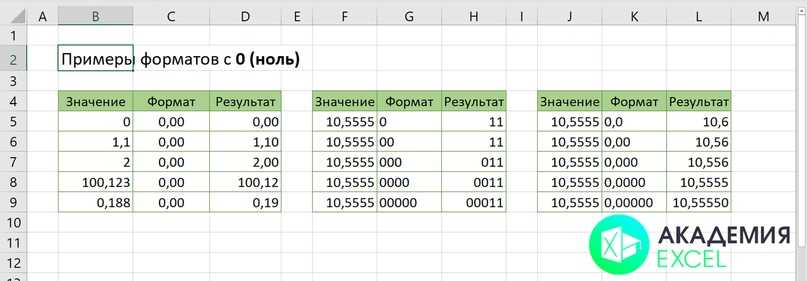Ноль (0) используется для принудительного отображения нулей, когда число имеет меньше цифр, чем нули в формате. Например, пользовательский формат 0,00 будет показывать нуль как 0,00, 1,1 как 1,10 и ,5 как 0,50.