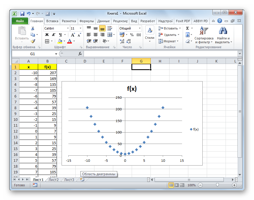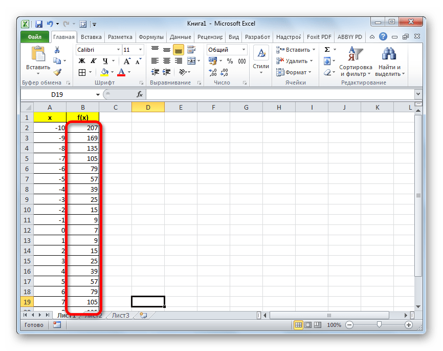 - После этого действия весь столбец «X» будет заполнен нужными нам данными, а именно числами в диапазоне от -10 до 10 с шагом 1.