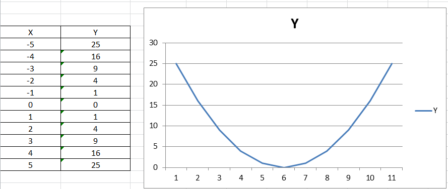 В столбце Y напротив -5 ставится = и нажимается значок функции fx. В появившемся окне Мастер функций выбирается категория Математические и находится (по алфавиту) СТЕПЕНЬ. Курсор на неё и нажать ОК. В появившемся окне Аргументы функции вставить курсор в строку Число, а потом в таблице выделить значения Х. В строке Число введётся диапазон. В строке окошка Степень поставить 2, раз функция квадратичная. В столбце Y таблицы напротив -5 появится цифра 25. Курсор в нижний правый угол ячейки с 25 и протащить вниз до конца таблицы. В каждой ячейке появится цифра.