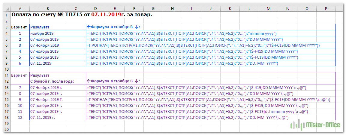 Как видите, здесь мы постарались охватить почти все возможные варианты написания. Вам нужно вручную настроить внешний вид ячеек с результатом. Что ж, если вам нужно сделать это автоматически, снова используйте функцию ТЕКСТ, как это было сделано чуть выше.