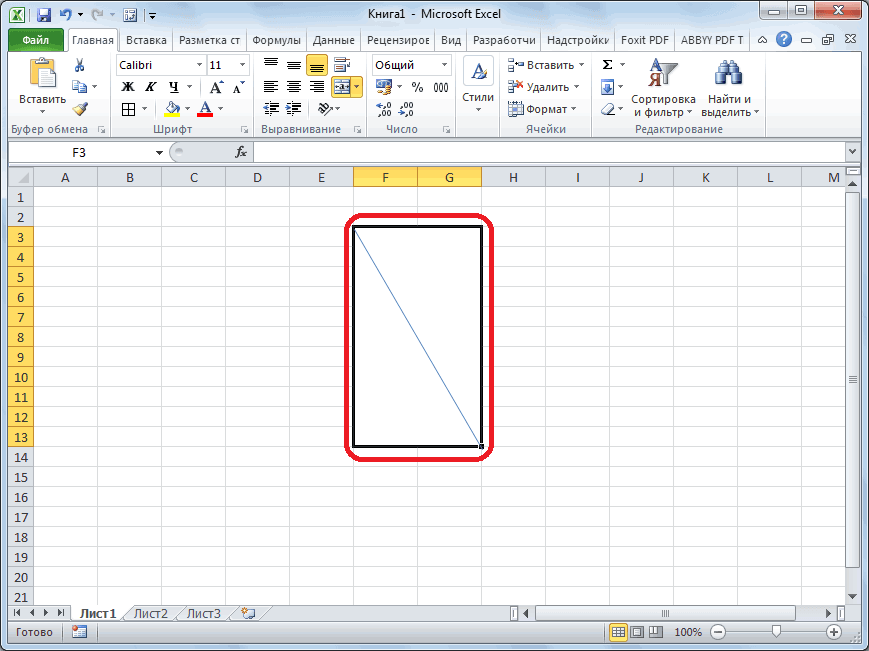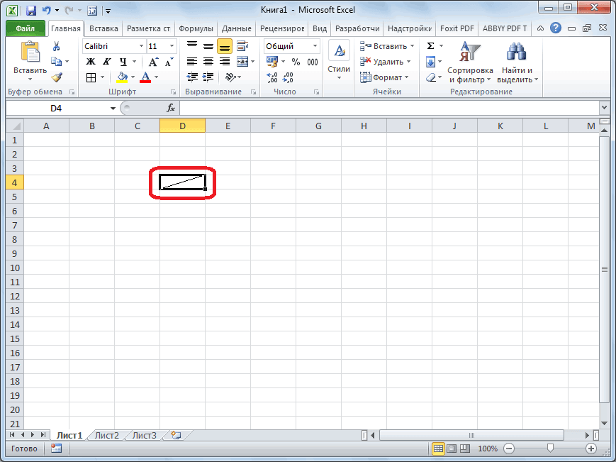 В результате в ячейке получилась диагональная линия, как показано ниже.