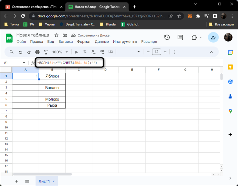 Аргумент B1<>»» в этом случае проверяет, есть ли в указанной ячейке какое-то значение. Если такое присутствует, то срабатывает вычисление функции СЧЁТЗ($B$1:B1). Она считает это значение и предыдущие, чтобы показать корректный номер в списке. «» в этой формуле нужно для того, чтобы не выводить никакое значение в тех строках, значения в которых напротив пустые. Попробуйте активировать эту формулу в своей таблице и вы сразу же увидите результат, но не забудьте только поменять номера ячеек.