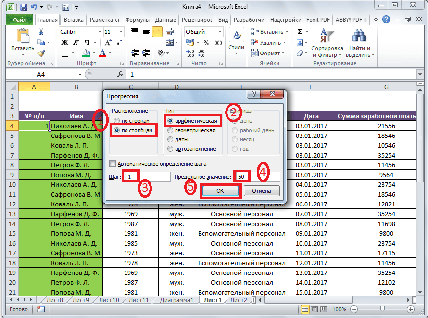 В появившемся списке выберите пункт «Прогрессия». Далее, задайте направление (столбцы либо строки), шаг и количество ячеек, которые будут пронумерованы, в разделе «Тип» отметьте точкой пункт «Арифметическая». После того как все параметры будут установлены, нажмите «ОК», и Excel всё сделает за вас.
