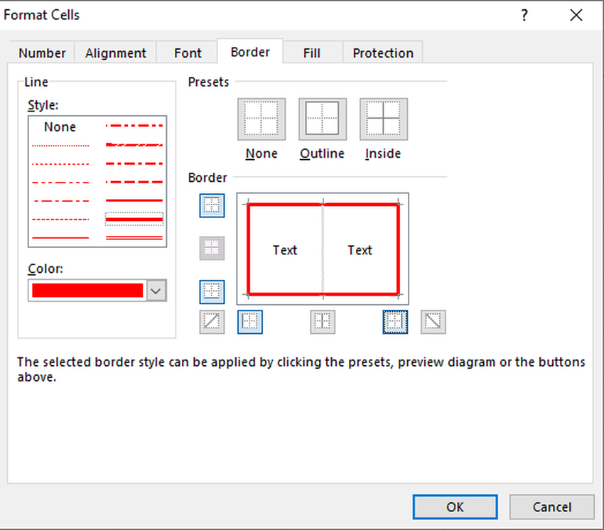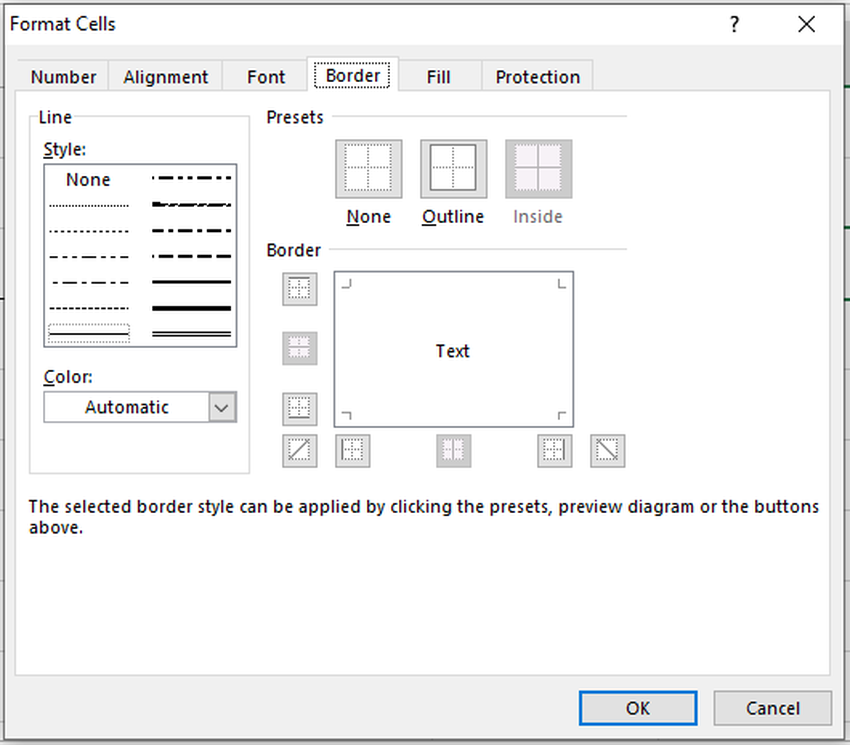 Вы также можете выбрать предустановленные форматы в диалоговом окне формата ячеек, чтобы добавить рамку контура, внутреннюю границу и предустановку Нет, чтобы удалить существующую границу.