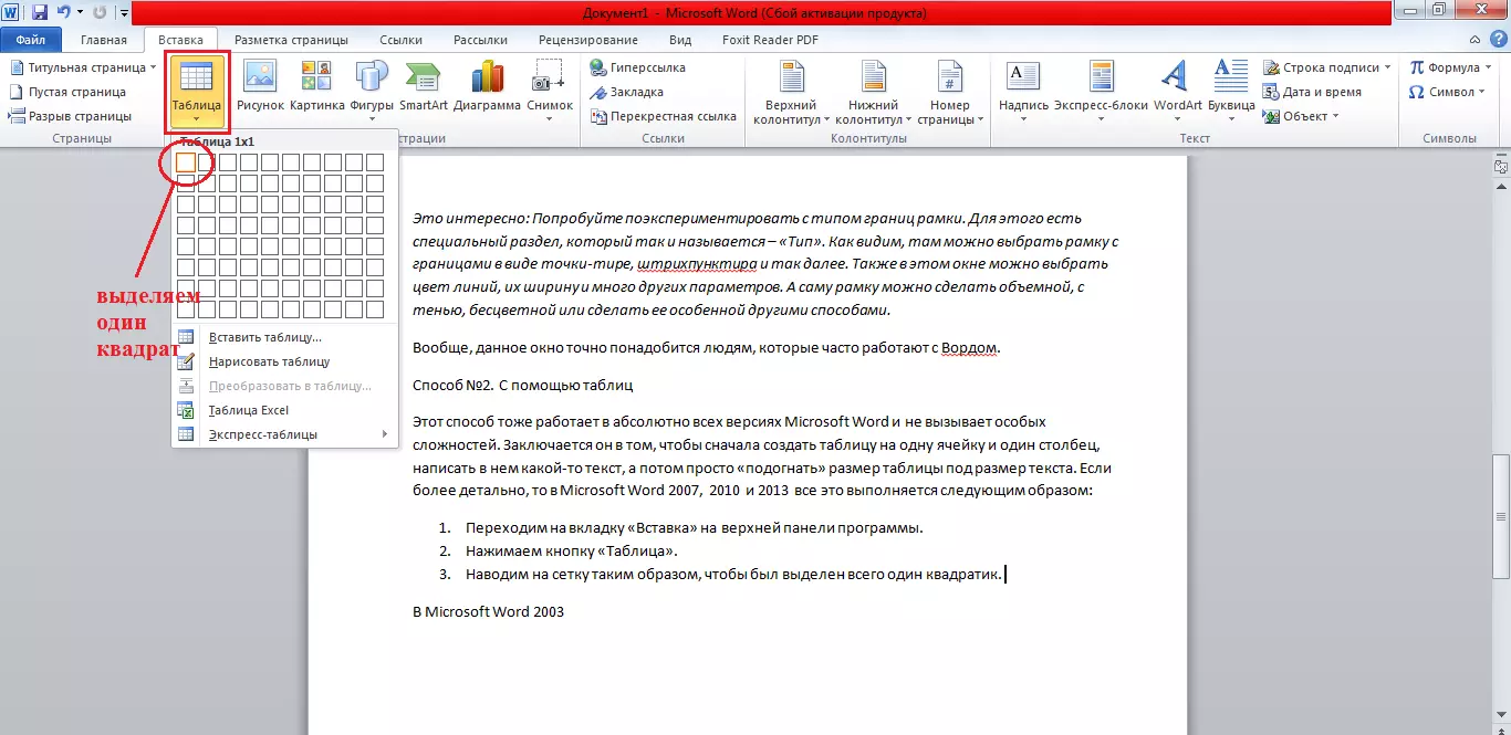 Заключается он в том, чтобы сначала создать таблицу на одну ячейку и один столбец, написать в нём какой-то текст, а потом просто «подогнать» размер таблицы под размер текста.
