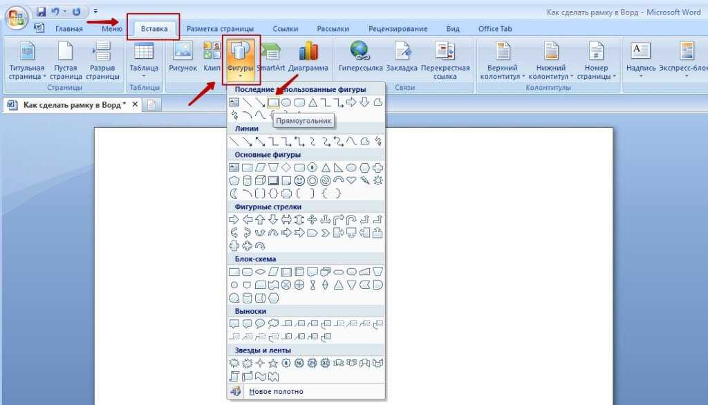 - Во вкладке «Вставка» выберите раздел «Фигуры». Откроется большое поле для дальнейшего выбора. Можно будет выбрать классический прямоугольник, а можно и любую другую фигуру. Все зависит от целей и задач текста.