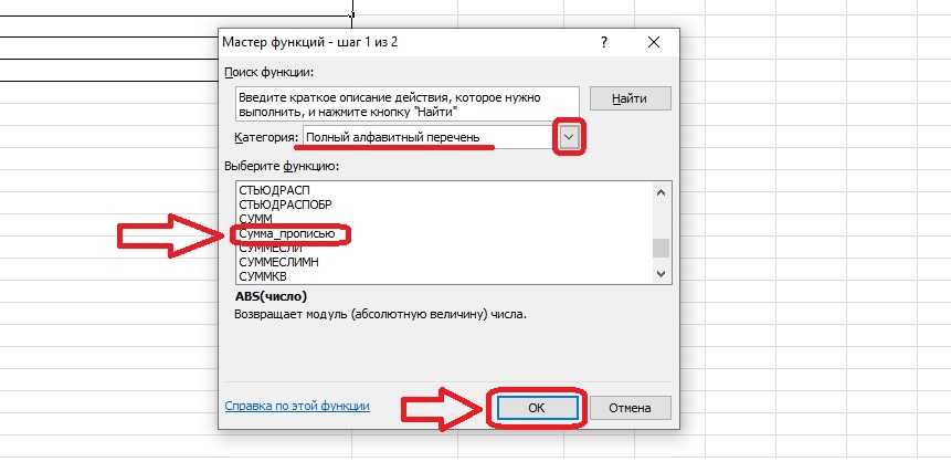 - Выберите вкладку «Полный алфавитный список». Вам нужно прокрутить вниз до буквы «C», потому что эта функция не вписывается ни в одну из узких категорий. Затем нужно кликнуть по названию функции «Сумма_прописью» и нажать «ОК».
