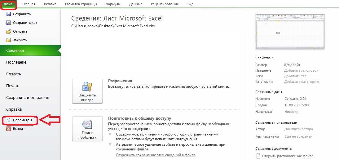 - Вам нужно открыть вкладку «Файл» документа Excel и выбрать раздел «Параметры». Обычно он находится внизу списка разделов.
