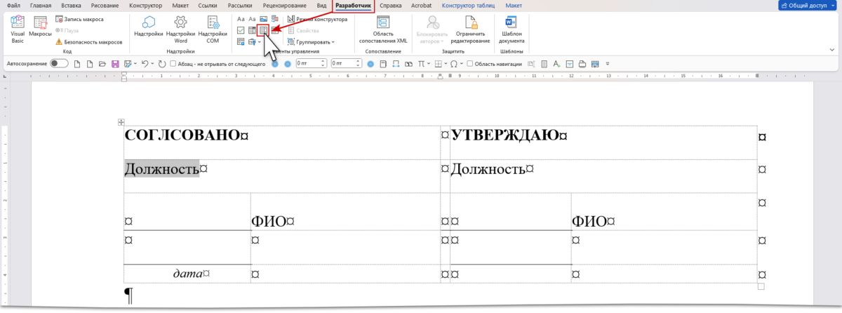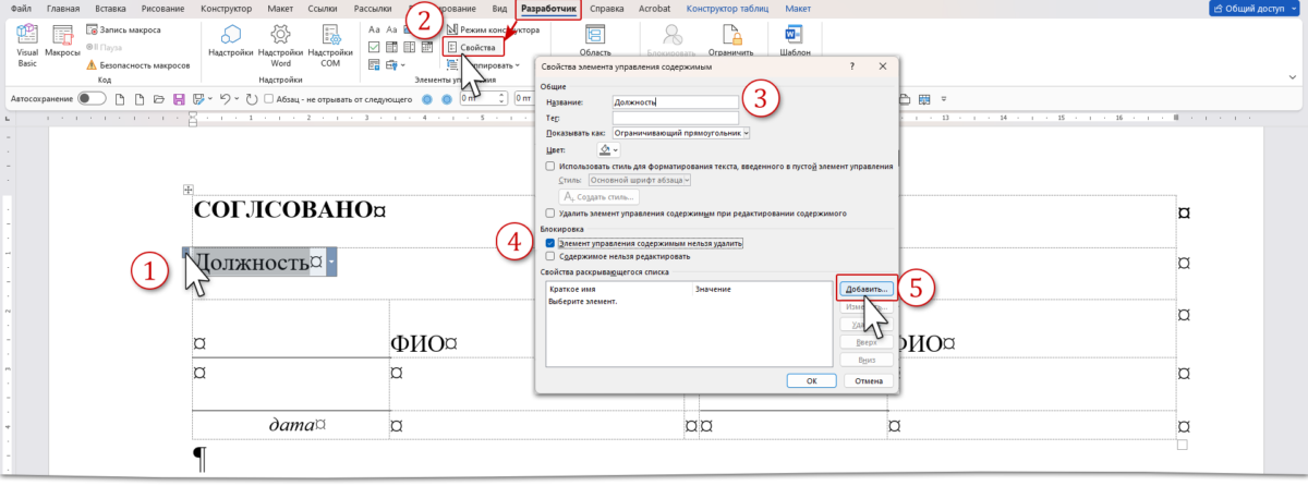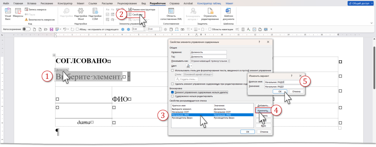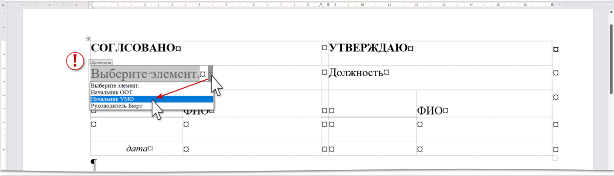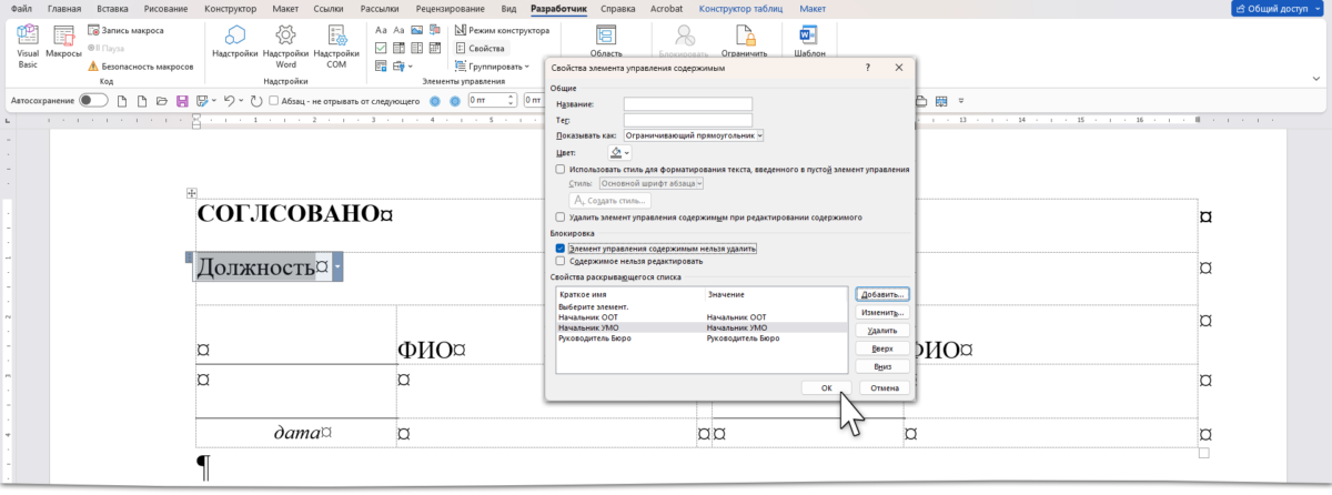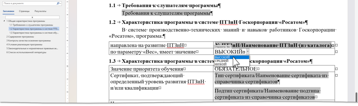 Элемент управления содержимым «Раскрывающийся список» может пригодится не только на официальном грифе «Утверждение». В моем шаблоне учебной программы раскрывающийся список встречается 7 раз: