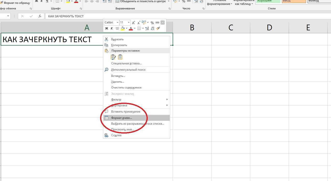 Это самый популярный метод зачеркивания текста. Он осуществляется при помощи окошка «Формат ячеек». Подробная инструкция: