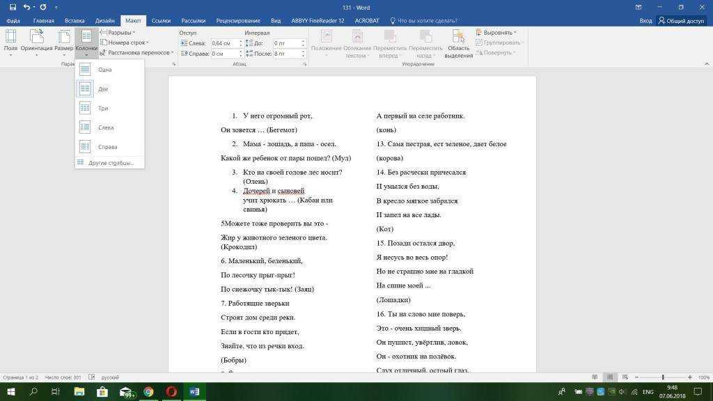 Один из самых известных приемов в редакторе, это сделать в документе 2 (две) колонки. В каких случаях этот метод может пригодится, описывалось выше, в этом же разделе, сделаем две колонки и покажем как это происходит на деле.