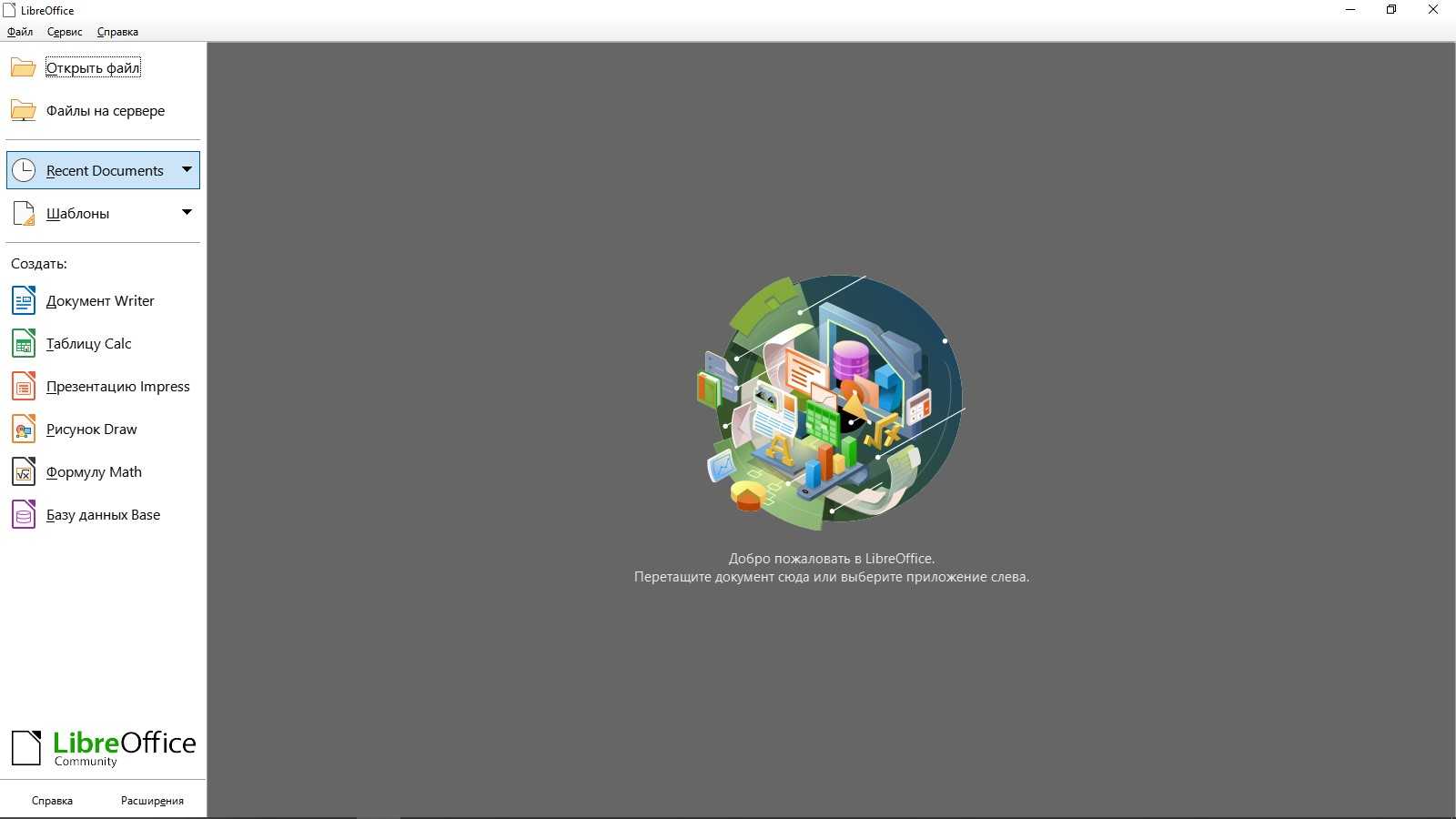 Что сразу хочется отметить у LibreOffice – то, что для создания документов разных форматов не приходится открывать разные приложения. После открытия просто выбираете нужный тип файла. Далее я буду описывать интерфейс программы в ОС Windows при создании текстовых файлов и таблиц.
