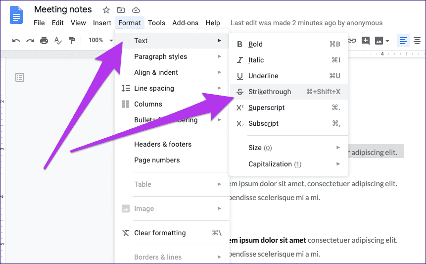 Сделав это, откройте меню «Формат», выберите «Текст» и нажмите «Зачеркнутый».