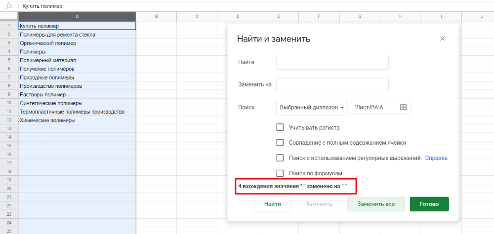 Еще один полезный инструмент, который поможет очистить вашу Google Таблицу, – это функция «Поиск и замена». Она позволит удалить все определенные слова или фразы из вашей таблицы.