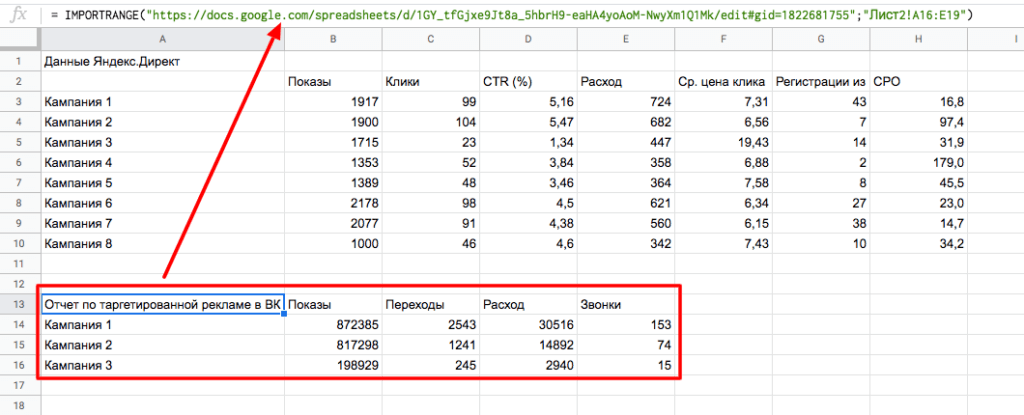 У нас есть две таблицы: одна – с отчетом по контекстной рекламе, другая – по таргетированной. Мы хотим, чтобы данные отчета по таргетированной рекламе отображались на одном листе с отчетом по контексту.
